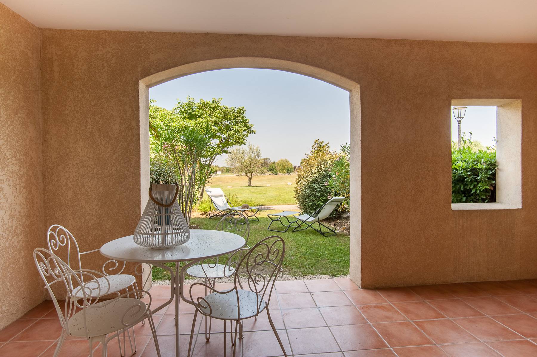 Emplacement idéal, une terrasse couverte, un jardinet verdoyant, vue sur le golf, piscine chauffée, place de parking.